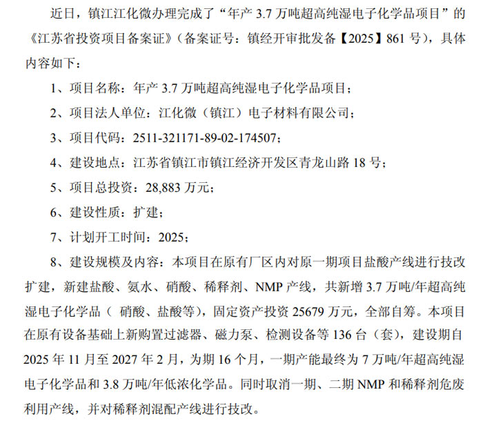 2025 年 11 月 19 日,江陰江化微電子材料股份有限公司(證券代碼:603078,簡稱 “江化微”)發(fā)布項(xiàng)目進(jìn)展公告,其全資子公司江化微(鎮(zhèn)江)電子材料有限公司(簡稱 “鎮(zhèn)江江化微”)投資的 “年產(chǎn) 3.7 萬噸超高純濕電子化學(xué)品項(xiàng)目” 已順利取得《江蘇省投資項(xiàng)目備案證》(備案證號:鎮(zhèn)經(jīng)開審批發(fā)備【2025】861 號),標(biāo)志著該擴(kuò)建項(xiàng)目正式進(jìn)入落地實(shí)施階段。