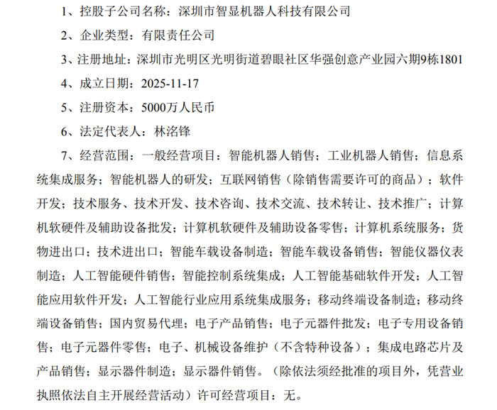 11 月 20 日,深圳市洲明科技股份有限公司發(fā)布公告稱,其聯(lián)合北京智譜華章科技股份有限公司、北京元客視界科技有限公司(凌云光技術(shù)股份有限公司全資子公司)共同投資設(shè)立的控股子公司 —— 深圳市智顯機(jī)器人科技有限公司,已完成工商登記并取得《營業(yè)執(zhí)照》,標(biāo)志著三方在 AI 智能終端領(lǐng)域的協(xié)同布局正式落地。
