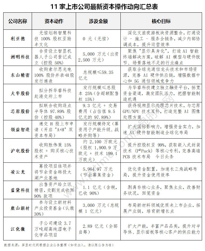 近期,利亞德、洲明科技、東山精密、大華股份、芯原股份、領(lǐng)益智造、滬士電子、凌云光、藍(lán)黛科技、鹿山新材、江化微11家上市公司披露最新資本運(yùn)作動(dòng)向。從利亞德文旅夜游板塊的內(nèi)部資源整合、洲明科技聯(lián)手 AI 巨頭布局 “顯示具身化”,到東山精密、領(lǐng)益智造沖刺港股上市、芯原股份跨界收購強(qiáng)化技術(shù)閉環(huán),十余家行業(yè)龍頭企業(yè)以股權(quán)劃轉(zhuǎn)、并購重組、分拆上市、基金設(shè)立等多元資本運(yùn)作,在 LED光顯、投影顯示芯片、AI 終端、半導(dǎo)體、光通信、文旅科技、電子材料等核心賽道展開深度布局。