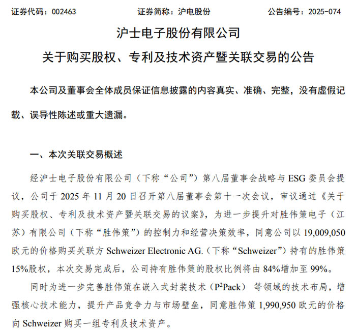 2025 年 11 月 21 日,滬士電子股份有限公司(證券代碼:002463,簡稱 “滬電股份”)發(fā)布公告稱,公司于 11 月 20 日召開第八屆董事會(huì)第十一次會(huì)議,審議通過關(guān)聯(lián)交易議案,擬以 1900.905 萬歐元收購關(guān)聯(lián)方 Schweizer Electronic AG.(簡稱 “Schweizer”)持有的勝偉策電子(江蘇)有限公司(簡稱 “勝偉策”)15% 股權(quán),并由勝偉策以 199.095 萬歐元收購 Schweizer 旗下一組核心專利及技術(shù)資產(chǎn),兩項(xiàng)交易合計(jì)金額超 2100 萬歐元。