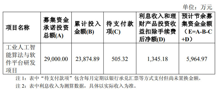 截至 2025 年 11 月 17 日,“工業(yè)人工智能算法與軟件平臺(tái)研發(fā)項(xiàng)目” 已完成全部研發(fā)工作并達(dá)成預(yù)期目標(biāo),正式結(jié)項(xiàng)。該項(xiàng)目承諾募集資金投資總額 2.9 億元,累計(jì)實(shí)際投入 2.387489 億元,待支付款項(xiàng) 505.32 萬元,同時(shí)通過閑置資金現(xiàn)金管理獲得利息及理財(cái)收益凈額 1345.18 萬元,最終形成節(jié)余募集資金 5964.97 萬元。