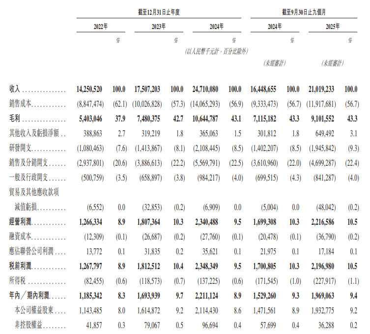 毛利從人民幣 54 億元增長至 106 億元,年復(fù)合增長率 40.4%,整體毛利率從 37.9% 提升至 43.1%;