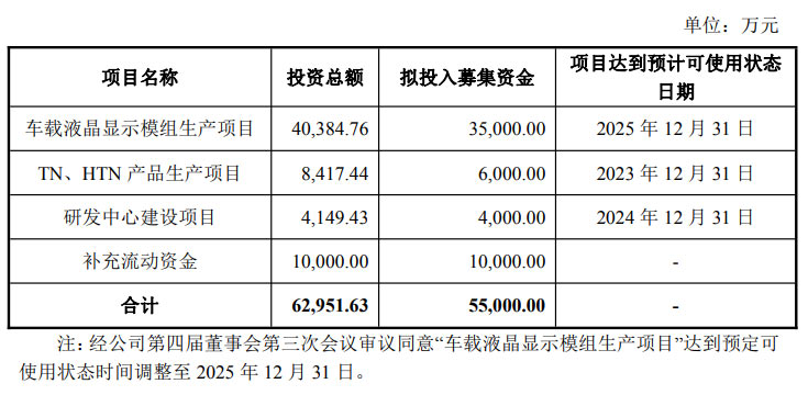 車載液晶顯示模組生產項目:投資總額 40,384.76 萬元,擬投入募集資金 35,000.00 萬元,原計劃達到預計可使用狀態(tài)日期為 2025 年 12 月 31 日(經公司第四屆董事會第三次會議審議同意調整);