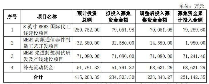 截至 2025 年 11 月 30 日,本次結(jié)項的 “MEMS 先進封裝測試研發(fā)及產(chǎn)線建設(shè)項目” 累計投入募集資金 7.12 億元,節(jié)余(含利息收入)66.48 萬元;其余三大募投項目中,“8 英寸 MEMS 國際代工線建設(shè)項目” 累計投入 7.93 億元,“MEMS 高頻通信器件制造工藝開發(fā)項目” 經(jīng) 2023 年調(diào)整后擬投入金額縮減至 1.46 億元,累計投入 1980 萬元,“補充流動資金” 項目調(diào)整后投入金額增至 6.86 億元并已全額投入。上述項目此前均已完成結(jié)項或達(dá)到預(yù)定可使用狀態(tài)。