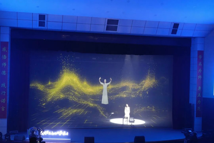 作為教育創(chuàng)新的重要推動(dòng)力,科技手段的融入為本次活動(dòng)注入了全新活力。無錫羿飛教育特別打造的全息投影舞臺(tái),以高流明激光投影機(jī)為核心,結(jié)合定制化沙幕系統(tǒng),實(shí)現(xiàn)了對舞臺(tái)劇《心壺》的沉浸式呈現(xiàn)!缎膲亍芬孕撵`成長為主題,通過全息技術(shù)將抽象的情感與哲思轉(zhuǎn)化為具象的三維影像:流動(dòng)的光影構(gòu)建出虛實(shí)交織的場景,人物與虛擬元素的互動(dòng)打破舞臺(tái)物理邊界,觀眾仿佛置身于故事之中,與角色共情共鳴。這種突破傳統(tǒng)舞臺(tái)形式的呈現(xiàn)方式,不僅提升了藝術(shù)表現(xiàn)力,更讓教育理念的傳遞更加生動(dòng)深刻。
