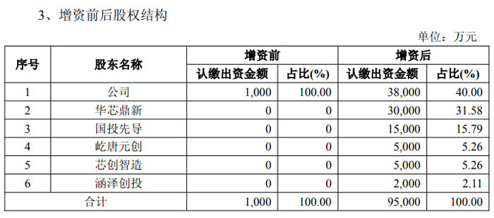 共同投資方方面,華芯鼎新、國(guó)投先導(dǎo)、屹唐元?jiǎng)?chuàng)、芯創(chuàng)智造、涵澤創(chuàng)投分別以現(xiàn)金 3 億元、1.5 億元、5000 萬(wàn)元、5000 萬(wàn)元、2000 萬(wàn)元認(rèn)繳對(duì)應(yīng)注冊(cè)資本,合計(jì)出資 5.7 億元。