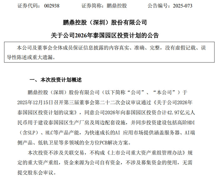近日,鵬鼎控股 (深圳) 股份有限公司(證券代碼:002938)發(fā)布公告稱(chēng),公司于 2025 年 12 月 15 日召開(kāi)第三屆董事會(huì)第二十二次會(huì)議,審議通過(guò)《關(guān)于公司 2026 年泰國(guó)園區(qū)投資計(jì)劃的議案》,同意 2026 年向泰國(guó)園區(qū)合計(jì)投資 42.97 億元人民幣,聚焦生產(chǎn)設(shè)施建設(shè)與高端 PCB 產(chǎn)品產(chǎn)能布局,助力 AI 應(yīng)用市場(chǎng)發(fā)展。