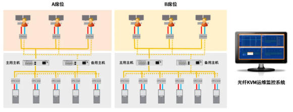 通過光纖將塔臺席位與機房服務器相連,每個席位可通過一套鍵鼠靈活操作多臺主機,實現(xiàn)音視頻、鍵鼠、串口等信號的遠距離無損傳輸。