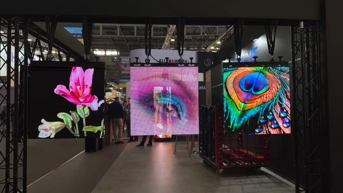 懸掛于展位上空的UR系列碳纖維超輕薄黑燈舞臺屏,無疑是展會現(xiàn)場的又一 “明星產(chǎn)品”。顯示高清高對比,碳纖維箱體輕巧靈活,還配備了抗風(fēng)架,搭配專用運輸車,吊裝高度可達(dá) 20 米。這一出色的性能使其成為海外眾多大型演出、活動舞臺的熱門選擇。