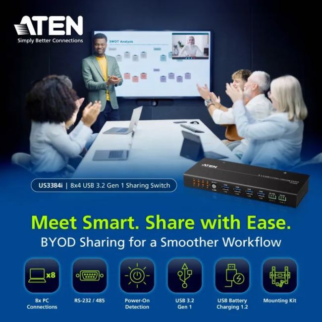 中國 北京(2024年2月6日)——全球領(lǐng)先的KVM及AV/IT連接與管理解決方案提供商ATEN宏正今日推出US3384i——行業(yè)首款支持8臺PC或筆記本電腦與4個USB 3.2 Gen 1設(shè)備共享的切換器。這款設(shè)備旨在通過全面提升BYOD(自帶設(shè)備)和BYOM(自帶會議)會議效率,滿足企業(yè)用戶在協(xié)作、數(shù)據(jù)共享和資源整合方面的高效需求。作為現(xiàn)代會議室的必備工具,US3384i以其高速傳輸、強大兼容性和無縫集成等創(chuàng)新功能,在BYOD會議和工業(yè)應(yīng)用領(lǐng)域均樹立了新標桿。