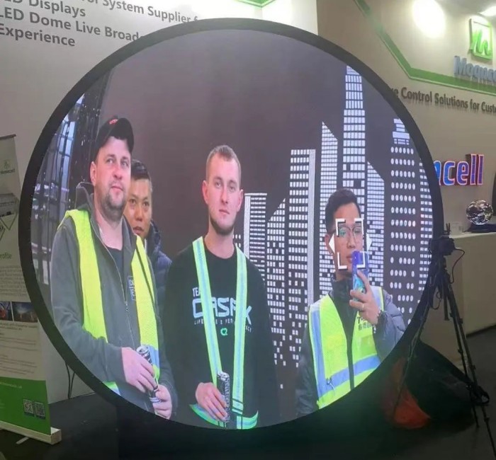 摩西爾內(nèi)球解決方案作為本場展會的最大亮點(diǎn),聚焦了觀眾目光。方案采用摩西爾異形主控獨(dú)有的動(dòng)態(tài)插值算法,對LED模組進(jìn)行內(nèi)球平面展開,利用圖像任意角度旋轉(zhuǎn)技術(shù),對每圈物理空隙處進(jìn)行圖像插值填補(bǔ),使球面圖像顯示上下左右相互連貫,實(shí)現(xiàn)超8K高清顯示。
