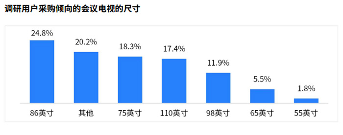 2024年,65-86英寸會議電視為市場主力,其出貨量高達(dá)83.25萬臺,在整體市場占比73.1%,其中75英寸最收歡迎,而86英寸則在未來換購升級訴求中占比更高。同時,98英寸及以上會議電視出貨量達(dá)20.96萬臺,占比提升至18.4%,未來預(yù)計穩(wěn)步增長?梢姡86英寸及以上的大尺寸將成為未來主流趨勢之一。