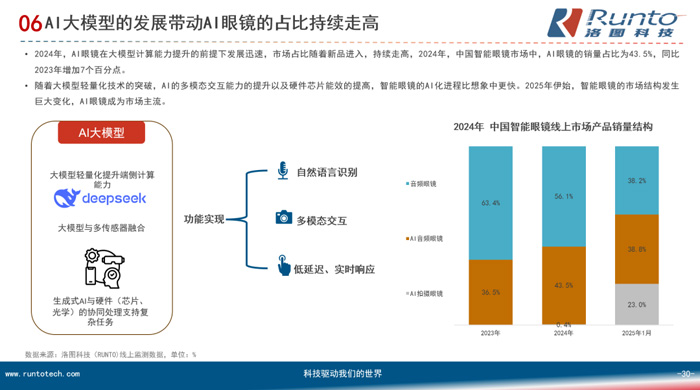 進(jìn)入2025年,在大模型輕量化、多模態(tài)交互能力增強(qiáng)以及硬件芯片能效提高的推動(dòng)下,智能眼鏡的AI化進(jìn)程仍然在加速。年初,以雷鳥V3為代表的AI拍攝眼鏡正式加入戰(zhàn)局,推動(dòng)國(guó)內(nèi)智能眼鏡市場(chǎng)的產(chǎn)品格局發(fā)生劇變,具備AI功能的眼鏡成為主流;AI拍攝眼鏡銷量激增,1月在線上市場(chǎng)的份額從幾乎忽略不計(jì)升至23.0%。這完全凸顯了消費(fèi)者對(duì)第一視角影像拍攝與多模態(tài)交互的強(qiáng)烈需求。