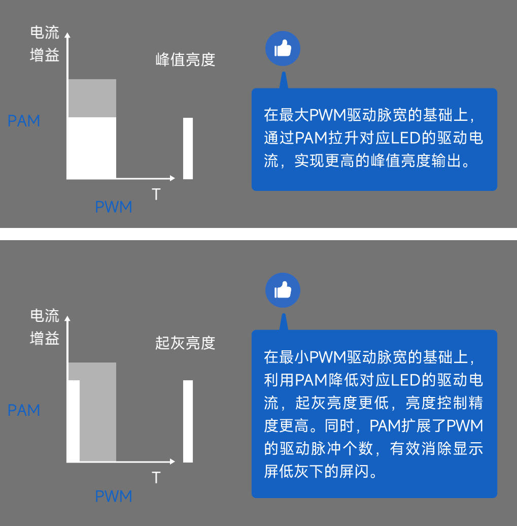PAM擴(kuò)展了PWM的驅(qū)動脈寬,為屏幕刷新提供了充裕的時間,1級灰階刷新高達(dá)360Hz,高階灰階超過15000Hz,畫面絲滑,徹底消除頻閃。