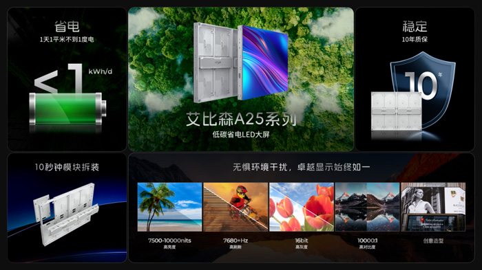 此次榮獲ISLE金顯獎的艾比森A25系列產(chǎn)品是一款低碳省電、顯示性能出眾的LED大屏,可廣泛應(yīng)用于廣告大牌、地標大牌、交通樞紐、體育場館等場景。據(jù)測算,A25系列每平米每天不到一度電,300m²大屏5年可節(jié)省電費高達144萬元人民幣;產(chǎn)品支持10年質(zhì)保與“零首付”,其高亮高刷高對比高灰度的卓越顯示性能,可確保復(fù)雜環(huán)境與場景下顯示不失真,助力戶外廣告行業(yè)低碳綠色轉(zhuǎn)型。