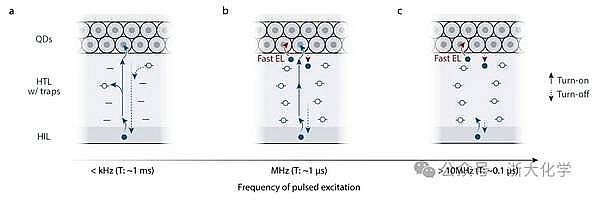 近日,我系金一政教授課題組聯(lián)合劍橋大學、成都電子科技大學等單位的國際研究團隊,在高頻響應量子點發(fā)光二極管(QLED)方向取得突破性進展。研究首次報道了QLED在脈沖驅動下的記憶效應,揭示了有機電荷傳輸層中深能級陷阱對量子點電致發(fā)光動力學的調控機制,創(chuàng)新性地將傳統(tǒng)認知中的材料缺陷轉化為性能提升的突破口,從而實現(xiàn)了迄今為止響應速度最快的QLED。相關成果在線發(fā)表于《自然-電子學》(Nature Electronics)。