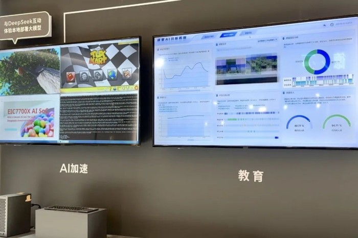 EIC7700X搭載RISC-V 64位CPU及自研NPU,支持全棧浮點計算和生成式大模型,可廣泛應用在機器視覺、智能機器人、安全生產等場景。EIC7702X擁有8核64位RISC-V亂序執(zhí)行CPU、自研NPU及雙GPU等多種計算單元,算力可達40 TOPS(INT8),能夠提供強大的計算能力和高效的AI處理能力。奕斯偉計算已實現DeepSeek大模型本地化部署,支持視頻和游戲場景,可現場操作互動展示,同時適配Debian、麒麟、統(tǒng)信等多種操作系統(tǒng)。