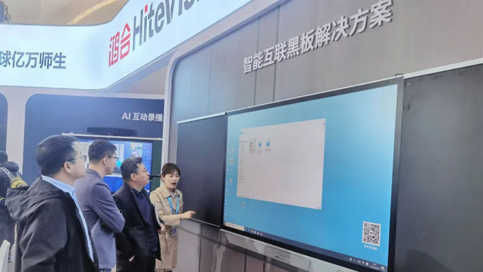 智能互聯(lián)黑板解決方案展區(qū),鴻合智能互聯(lián)黑板以“綠色護眼、無界互聯(lián)”為特色,通過萊茵低藍光認證面板與4K超廣角顯示,實現(xiàn)板書無限延展與遠程分享;支持課堂內(nèi)容一鍵錄制、實時互動,滿足線上線下混合教學需求。