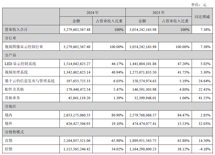 分產(chǎn)品看,LED顯示控制系統(tǒng)業(yè)務(wù)實現(xiàn)營收15.14億元,營收占比46.17%,同比增長5.02%;視頻處理系統(tǒng)業(yè)務(wù)實現(xiàn)營收13.43億元,營收占比40.94%,同比增長5.30%;基于云的信息發(fā)布與管理系統(tǒng)業(yè)務(wù)實現(xiàn)營收1.98億元,營收占比6.03%,同比增長24.64%;配件及其他業(yè)務(wù)實現(xiàn)營收1.79億元,營收占比5.47%,同比增長22.41%。