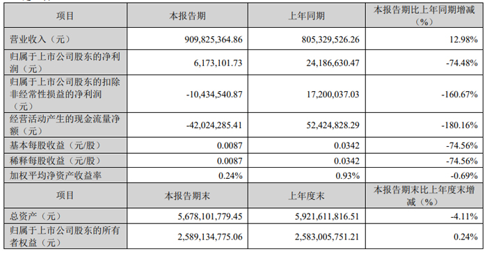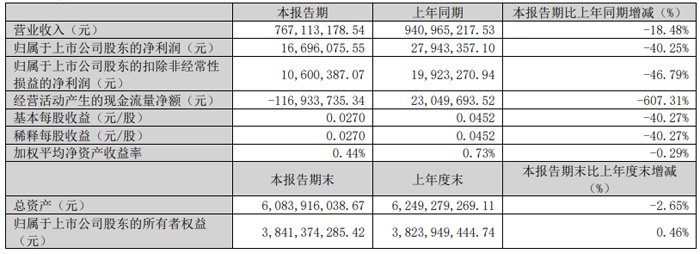報告期內(nèi),基本每股收益0.0283元/股,經(jīng)營活動產(chǎn)生的現(xiàn)金流量凈額1.39億元,同比下降13.52%。報告期末,總資產(chǎn)138.00億元,同比增加0.64%;歸屬于上市公司股東的所有者權(quán)益81.20億元,同比增加2.77%。