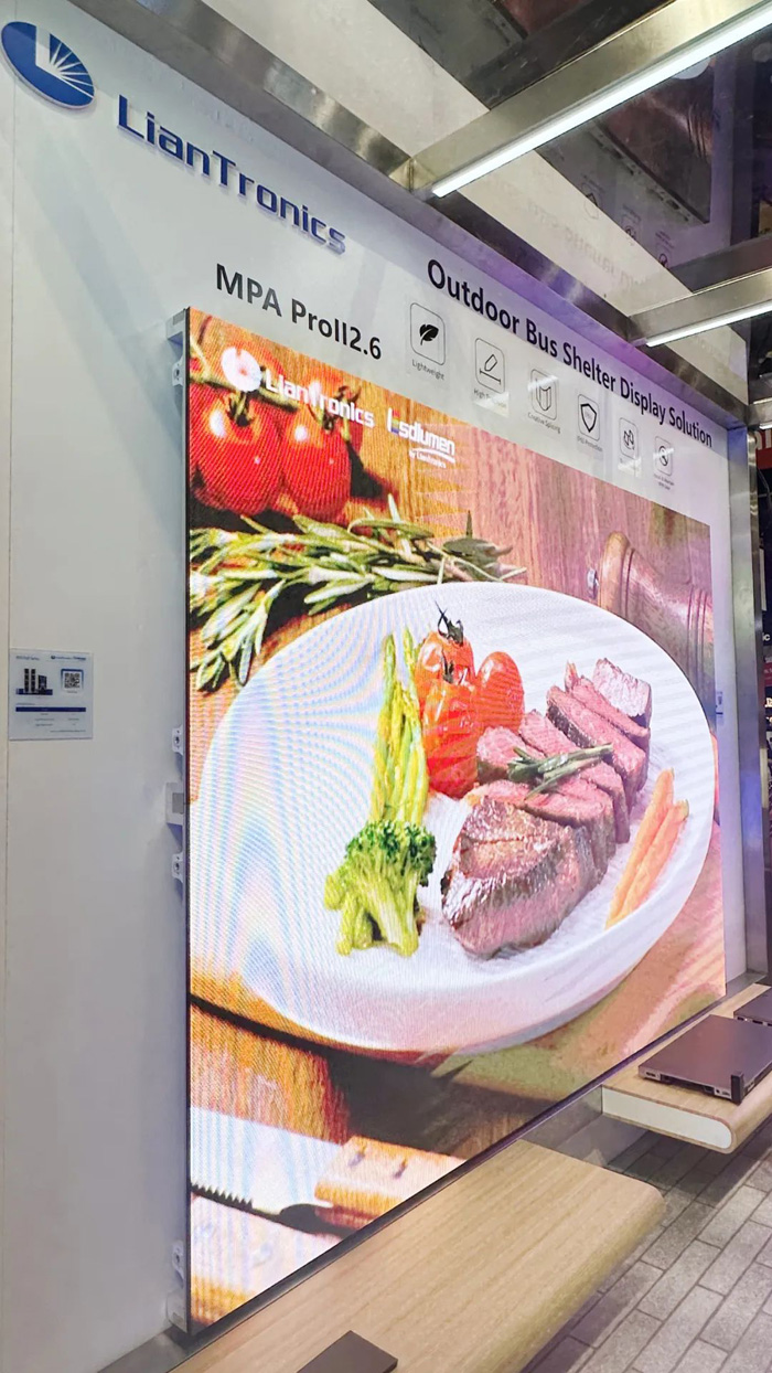 聯(lián)建光電的戶外顯示解決方案覆蓋了大至中小間距顯示場(chǎng)景。此次重點(diǎn)展出的產(chǎn)品 MPA ProⅡ,采用專利面罩,輕薄精巧且高亮節(jié)能、散熱佳,運(yùn)行穩(wěn)定。搭配公交站臺(tái)場(chǎng)景一起展出,讓客戶對(duì)產(chǎn)品的應(yīng)用有更加直觀的了解。