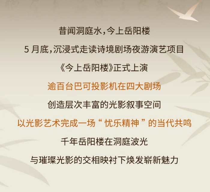 《今上岳陽(yáng)樓》充分融合歷史文化與戲劇,以“四大劇場(chǎng)”構(gòu)建詩(shī)境場(chǎng)域,巴可投影機(jī)絢麗影像與實(shí)景完美融合,讓觀眾在行進(jìn)式走讀中領(lǐng)略憂樂(lè)深意。