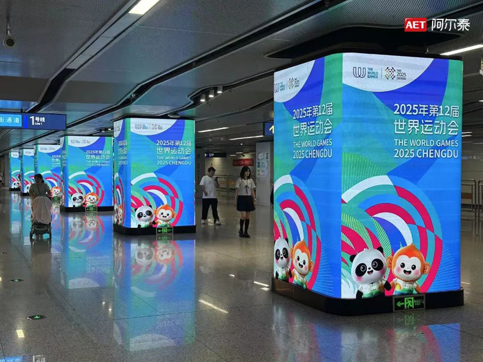 以光為炬,共襄盛會!當賽事激情席卷蓉城,由AET阿爾泰打造的成都地鐵850㎡裸眼3D光顯矩陣——覆蓋14條地鐵線路、19個核心站點的44根LED包柱,瞬間變身賽事捷報傳播新陣地和國際化城市形象新載體,向世界展開一幅融合成都魅力與體育精神的未來畫卷。