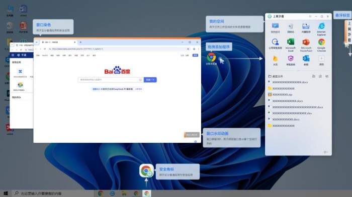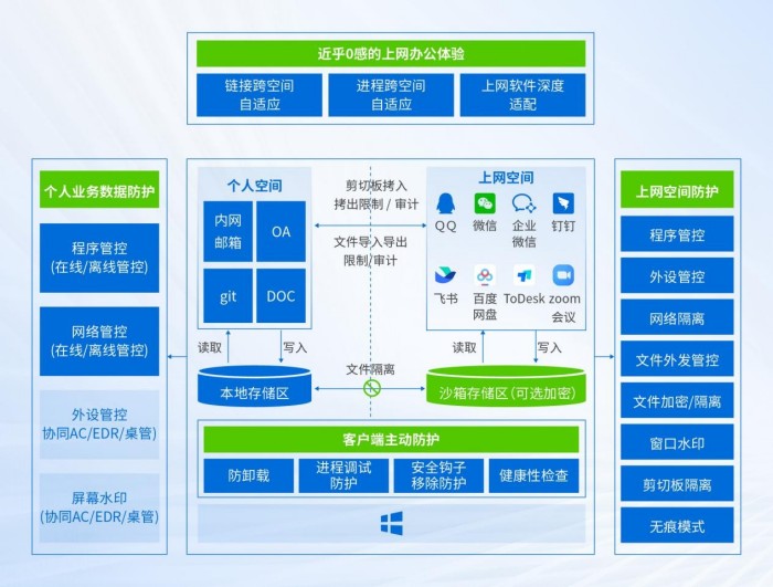 用戶體驗(yàn)感好:在員工使用終端的過程中,可以通過本地空間的進(jìn)程白名單能力不改變其原有業(yè)務(wù)操作習(xí)慣,或者在訪問互聯(lián)網(wǎng)時(shí),通過鏈接或程序自適應(yīng)提示即可自動(dòng)拉起上網(wǎng)空間,操作簡單,讓“小白用戶也能輕松使用”。