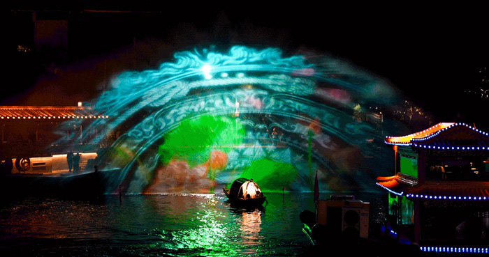 利用運(yùn)河水,升起兩處不同的水幕,光峰工程投影將光影投射其中,光影與真人演繹交融,帶來震撼的視覺沖擊與情感共鳴。