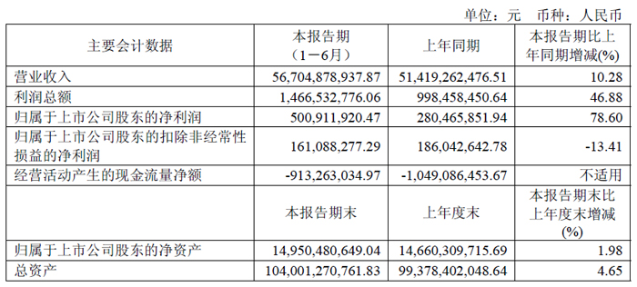 報告期內(nèi),本集團實現(xiàn)營業(yè)收入約567.05億元,同比增長約10.28%;實現(xiàn)歸屬于上市公司股東的凈利潤約5.01億元,同比增加約78.60%。
