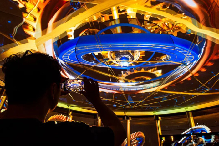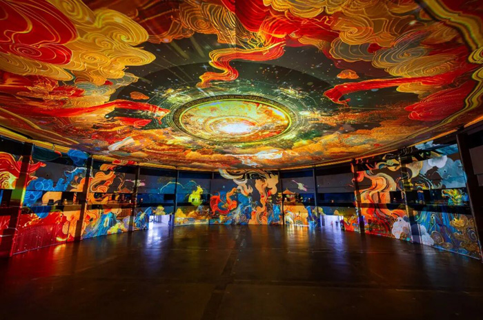 360°沉浸式包裹感的影像鋪滿整個(gè)穹頂空間,視線所及皆是流動(dòng)的光影,觀眾仿佛被吞入一個(gè)巨大的全息空間,現(xiàn)實(shí)世界的邊界瞬間溶解。觀眾站在穹頂之下,投影從四面八方涌來(lái),人成了漂浮在光影宇宙中的一粒微塵。