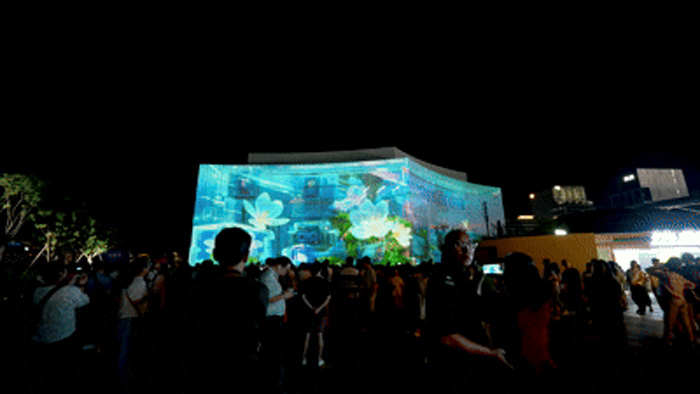 主會(huì)場(chǎng)西岸大劇院的光影秀位于劇院建筑的北側(cè)墻體,總長(zhǎng)86米,高度23.45米。劇院有著獨(dú)特的外觀造型,外立面采用凸起的直線型線條詮釋“水岸漣漪”概念,北面墻體整體還呈夾角結(jié)構(gòu),這都為投影增加了難度。投影工程師們精心設(shè)計(jì)投影機(jī)安裝位置與光路,確保觀眾可以在現(xiàn)場(chǎng)的多個(gè)角度都能隨時(shí)觀看到精彩的影像。