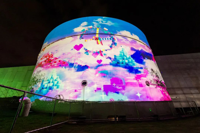 油罐藝術(shù)中心作為曾經(jīng)城市工業(yè)歷史的遺存,在光影節(jié)期間也披上了光影的外衣。其中的5號(hào)罐,與穹頂藝術(shù)中心和西岸大劇院的投影秀遙相輝映。在它們之間的廣場(chǎng)上,“東方有吉市”光影市集為光影節(jié)更添熱鬧。5號(hào)油罐和罐體上生動(dòng)的光影,成為了市集的背景。讓觀眾在欣賞光影的同時(shí),也可以邊玩邊逛,在光影節(jié)度過(guò)美好一晚。