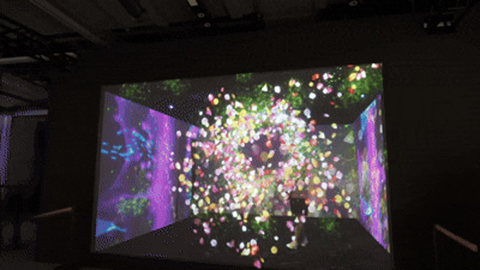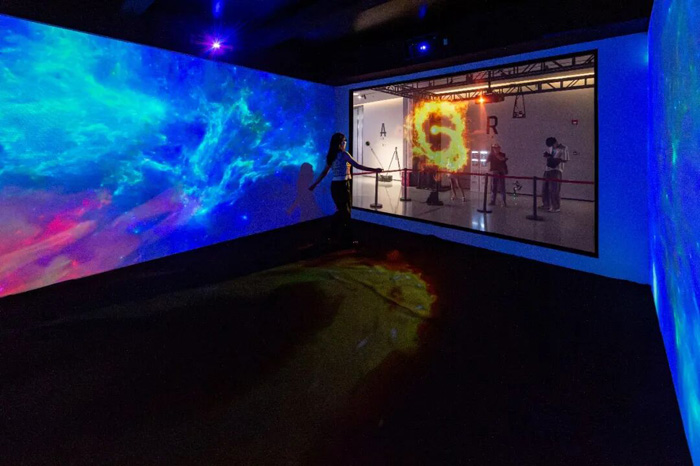 其中的《舞影隨行》展項(xiàng)使用全息舞臺(tái)投影、體感高速追蹤兩種技術(shù),創(chuàng)造出靈動(dòng)奇幻的氛圍。真人與光影同臺(tái)演出,影像與人的動(dòng)作無(wú)延遲互動(dòng),不停律動(dòng)變幻,虛實(shí)疊加,既有寫(xiě)實(shí),也有寫(xiě)意,盡顯藝術(shù)與科技融合的魅力。松下獨(dú)有的高速實(shí)時(shí)追蹤投影技術(shù),是實(shí)現(xiàn)人與光影實(shí)時(shí)互動(dòng)的關(guān)鍵。配合高速追蹤投影,還構(gòu)建了沉浸式CAVE空間,使人置身于光影之中,讓人直接成為塑造光影故事的核心要素,營(yíng)造“人動(dòng)光隨”的創(chuàng)意體驗(yàn)。