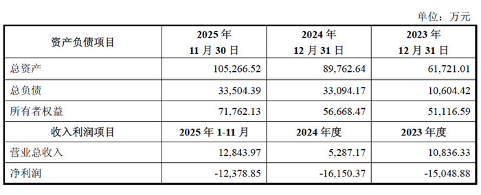財(cái)務(wù)數(shù)據(jù)顯示,杭州眾硅 2023 年末總資產(chǎn) 61721.01 萬元,總負(fù)債 10604.42 萬元,所有者權(quán)益 51116.59 萬元,當(dāng)年?duì)I業(yè)總收入 10836.33 萬元,凈利潤 - 15048.88 萬元;2024 年末總資產(chǎn) 89762.64 萬元,總負(fù)債 33094.17 萬元,所有者權(quán)益 56668.47 萬元,營業(yè)總收入 5287.17 萬元,凈利潤 - 16150.37 萬元;2025 年 1-11 月,公司總資產(chǎn) 105266.52 萬元,總負(fù)債 33504.39 萬元,所有者權(quán)益 71762.13 萬元,營業(yè)總收入 12843.97 萬元,凈利潤 - 12378.85 萬元。根據(jù)設(shè)備驗(yàn)收情況,預(yù)計(jì)公司 2025 年度營業(yè)收入約為 2.4 億元。