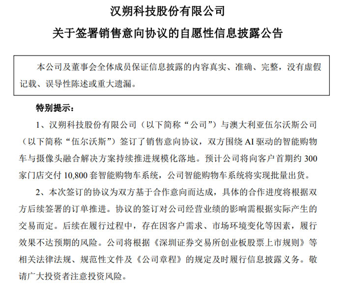 2026 年 1 月 5 日,漢朔科技股份有限公司(證券代碼:301275,證券簡稱:漢朔科技)發(fā)布自愿性信息披露公告,宣布與澳大利亞著名大型食品零售商伍爾沃斯公司(ISIN:AU000000WOW2,證券代碼:WOW)簽署《智能購物車及攝像頭銷售意向協(xié)議》,雙方將圍繞 AI 驅(qū)動的智能購物車與攝像頭融合解決方案推進聯(lián)合創(chuàng)新及規(guī);涞兀局悄苜徫镘囅到y(tǒng)即將實現(xiàn)批量出貨。