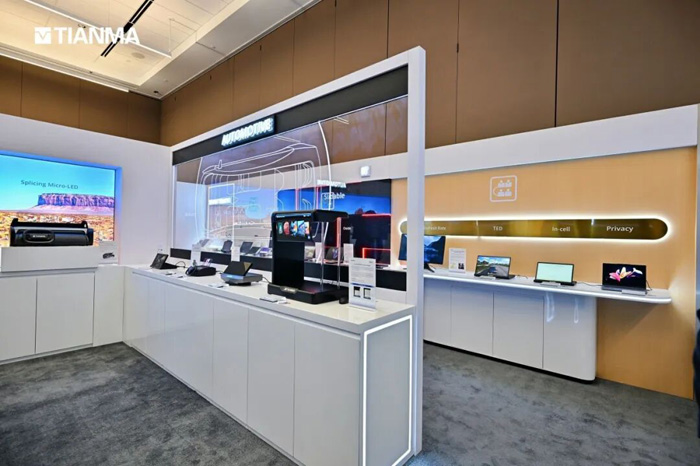 天馬天工屏展示區(qū),天馬最新發(fā)布的兩款新品 ——超能窄邊「天工」屏與臻彩健康「天工」屏也集中亮相,以領(lǐng)先的顯示技術(shù)與人性化設計,面向全球觀眾展現(xiàn)了天馬在高端屏幕領(lǐng)域的硬核實力。