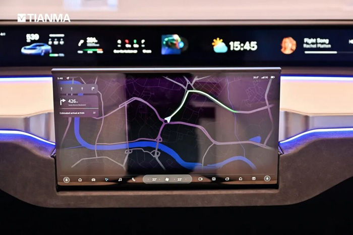 天馬新一代智能座艙中,49.6英寸全景沉浸「天軒」屏作為座艙“信息中樞”,以1.25米C型超廣曲面形態(tài),實現(xiàn)儀表、中控、副駕與后視鏡的一體化集成。搭配康寧先進冷彎蓋板玻璃,R3000曲面無縫貼合擋風玻璃,形成安全交互;依托天馬ACRUS精準像素級調(diào)光技術(shù),超21萬個獨立調(diào)光單元,實現(xiàn)100,000:1的極致對比度,創(chuàng)新防倒影設計,還將擋風倒影亮度比例控制在0.55%以下,融合動態(tài)影像系統(tǒng),為全天候駕駛提供安心防護。