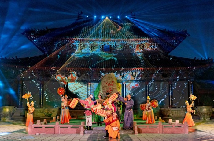 天王殿外墻與薄紗幕上的沉浸式投影,成為這場講述宋代傳奇清官包拯生平故事的演出的一大視覺亮點