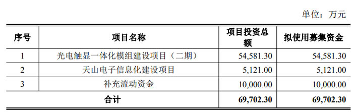 根據(jù)預(yù)案,本次募集資金扣除發(fā)行費(fèi)用后,將全部用于三大項(xiàng)目:其中 54,581.30 萬元投入光電觸顯一體化模組建設(shè)項(xiàng)目(二期),5,121.00 萬元用于天山電子信息化建設(shè)項(xiàng)目,10,000.00 萬元補(bǔ)充流動(dòng)資金,總投資額與擬使用募集資金金額一致。