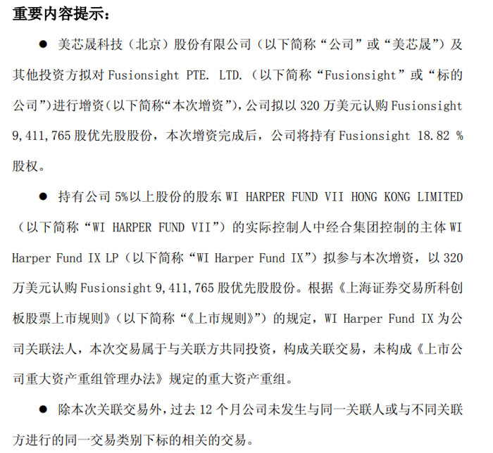 2026 年 1 月 20 日,美芯晟科技 (北京) 股份有限公司(證券代碼:688458,證券簡(jiǎn)稱:美芯晟)發(fā)布公告,宣布擬與關(guān)聯(lián)方及其他投資方共同對(duì) Fusionsight PTE. LTD.(以下簡(jiǎn)稱 “Fusionsight”)進(jìn)行增資,公司將以 320 萬美元自有資金認(rèn)購其 9,411,765 股優(yōu)先股股份,交易完成后將持有 Fusionsight 18.82% 股權(quán),借此切入下一代智能感知硬件領(lǐng)域,實(shí)現(xiàn)技術(shù)協(xié)同與產(chǎn)業(yè)鏈互補(bǔ)。