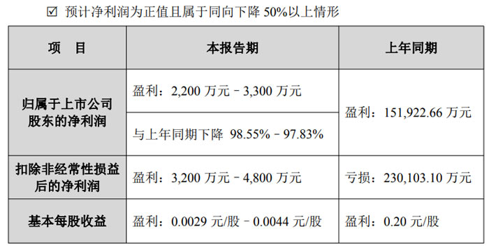 2026 年 1 月 21 日,合力泰科技股份有限公司(證券代碼:002217,證券簡稱:合力泰)發(fā)布 2025 年度業(yè)績預告。公司預計業(yè)績呈現(xiàn)歸屬于上市公司股東的凈利潤同向下降 50% 以上的情形。具體來看,歸屬于上市公司股東的凈利潤預計為 2200 萬元 - 3300 萬元,上年同期則為盈利 151922.66 萬元,同比下降 97.83%-98.55%;扣除非經(jīng)常性損益后的凈利潤預計為 3200 萬元 - 4800 萬元,上年同期為虧損 230103.10 萬元,實現(xiàn)扭虧為盈;基本每股收益預計為 0.0029 元 / 股 - 0.0044 元 / 股,上年同期為 0.20 元 / 股。