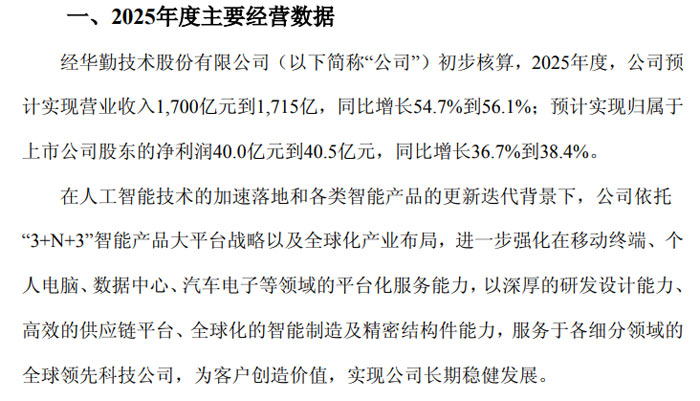 2026 年 1 月 22 日,華勤技術(shù)股份有限公司(證券代碼:603296,證券簡稱:華勤技術(shù))發(fā)布《2025 年度主要經(jīng)營數(shù)據(jù)的公告》。經(jīng)初步核算,華勤技術(shù) 2025 年度經(jīng)營業(yè)績實(shí)現(xiàn)顯著增長。公司預(yù)計(jì)實(shí)現(xiàn)營業(yè)收入?yún)^(qū)間為 1700 億元至 1715 億元,同比增幅達(dá) 54.7%至 56.1%;預(yù)計(jì)實(shí)現(xiàn)歸屬于上市公司股東的凈利潤 40.0 億元至 40.5 億元,同比增長 36.7% 至 38.4%,營收與凈利均呈現(xiàn)穩(wěn)健攀升態(tài)勢。