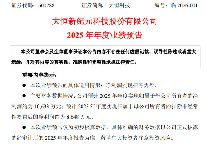 近日,大恒新紀元科技股份有限公司(證券代碼:600288,證券簡稱:大恒科技)發(fā)布 2025 年年度業(yè)績預(yù)告(編號:臨 2026-001)。業(yè)績預(yù)告顯示,公司 2025 年年度業(yè)績實現(xiàn)顯著改善,成功扭虧為盈。