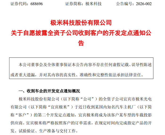 近日,極米科技股份有限公司(證券代碼:688696,證券簡(jiǎn)稱:極米科技)發(fā)布公告稱,其全資子公司宜賓市極米光電有限公司(以下簡(jiǎn)稱 “宜賓極米”)收到某國(guó)內(nèi)知名汽車(chē)主機(jī)廠的第二個(gè)開(kāi)發(fā)定點(diǎn)通知,宜賓極米將正式成為該客戶某車(chē)型的車(chē)載投影供應(yīng)商。
