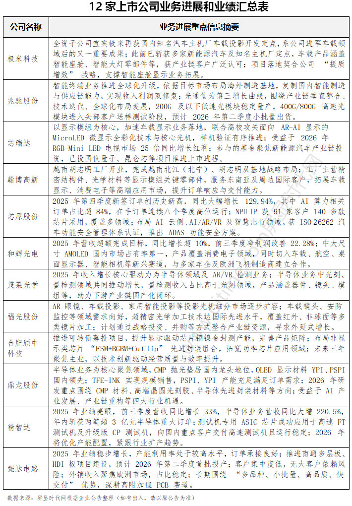 近期,極米科技、兆馳股份、芯瑞達(dá)、翰博高新、芯原股份、和輝光電、茂萊光學(xué)、福光股份、頎中科技、鼎龍股份、精智達(dá)、強(qiáng)達(dá)電路12家深耕半導(dǎo)體、顯示面板、車(chē)載及光學(xué)配套核心賽道的上市公司,陸續(xù)通過(guò)企業(yè)公告、投資者關(guān)系活動(dòng)、官方公眾號(hào)等渠道,披露了最新業(yè)務(wù)突破、業(yè)績(jī)成績(jī)單及中長(zhǎng)期戰(zhàn)略布局,集中展現(xiàn)了國(guó)內(nèi)核心產(chǎn)業(yè)鏈的發(fā)展活力與創(chuàng)新態(tài)勢(shì)。
