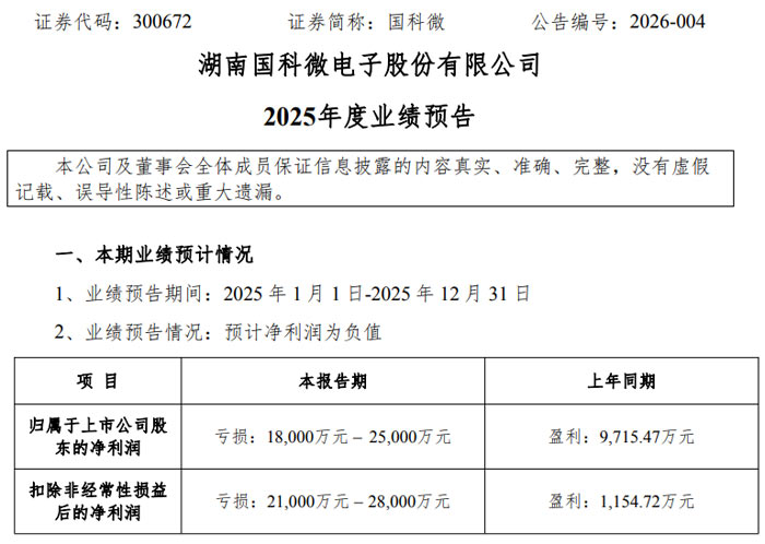 2026 年 1 月 26 日,湖南國科微電子股份有限公司(證券代碼:300672,證券簡稱:國科微)發(fā)布 2025 年度業(yè)績預(yù)告(公告編號:2026-004),公司本期業(yè)績預(yù)計呈現(xiàn)虧損狀態(tài)。其中,歸屬于上市公司股東的凈利潤預(yù)計虧損 18,000 萬元至 25,000 萬元,而上年同期該指標為盈利 9,715.47 萬元;扣除非經(jīng)常性損益后的凈利潤預(yù)計虧損 21,000 萬元至 28,000 萬元,上年同期則為盈利 1,154.72 萬元。
