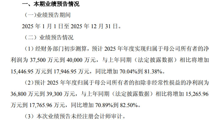 歸屬于母公司所有者的扣除非經(jīng)常性損益的凈利潤為 36,800 萬元至 39,300 萬元,較上年同期 21,534.04 萬元增加 15,265.96 萬元至 17,765.96 萬元,同比增長 70.89% 至 82.50%。值得注意的是,本次業(yè)績預(yù)告尚未經(jīng)注冊會計師審計。