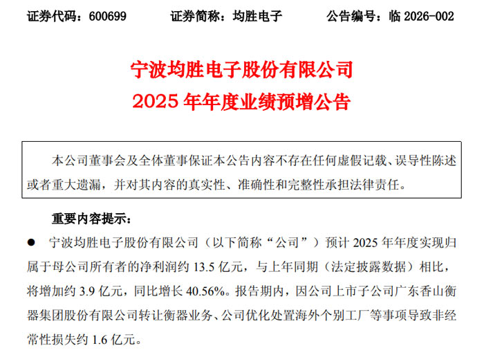 近日,寧波均勝電子股份有限公司(證券代碼:600699,證券簡稱:均勝電子)發(fā)布 2025 年年度業(yè)績預(yù)增公告(公告編號:臨 2026-002),公司預(yù)計 2025 年經(jīng)營業(yè)績實現(xiàn)顯著增長,各項核心財務(wù)指標(biāo)表現(xiàn)亮眼。