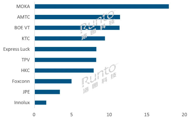同時(shí),工廠之間的分化較大,十家專(zhuān)業(yè)ODM代工廠有四家上漲六家下跌。其中,擁有核心面板資源的MOKA(茂佳)和BOE VT(視訊)出貨量同比增幅靠前。BOE VT的增幅居行業(yè)第一,高達(dá)37.5%;上漲的另外兩家Express Luck(彩迅)和HKC(惠科)的增幅在5%上下。